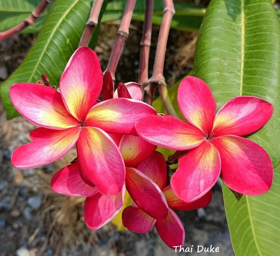 Plumeria 'Duke' is a bold and fragrant variety with vibrant red and pink blooms, a strong fruity scent, and heavy blooming capacity. Its cultural significance, dynamic. 6 SEEDS
